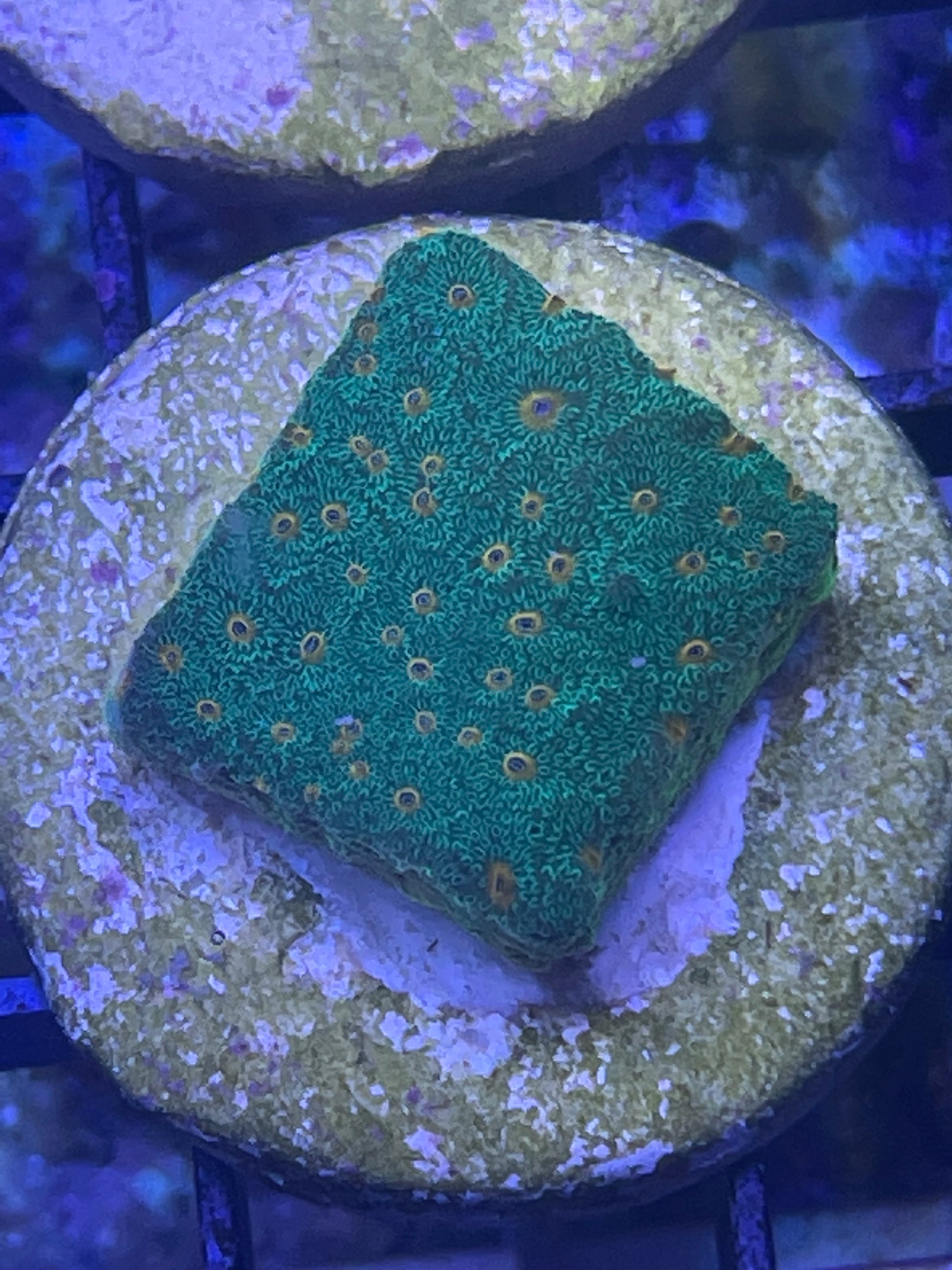An example of "showing your age" with some true beauty. Apache Chief acropora holds a robust neon green in the mature tissue, heavenly pearl white in the middle, and a royal purple on the tips.
