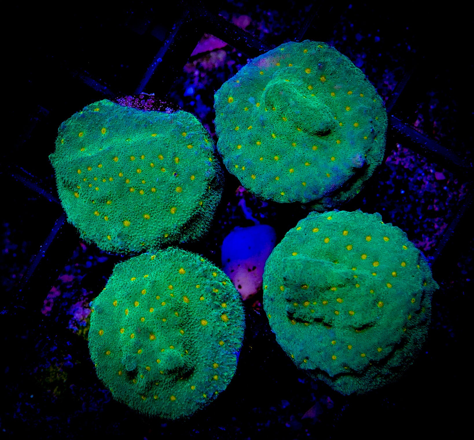 Shades of green with bright orange polyps. Collector piece! Originally obtained from Cherry Corals in 2018 at CT Frag Farmer's Market.